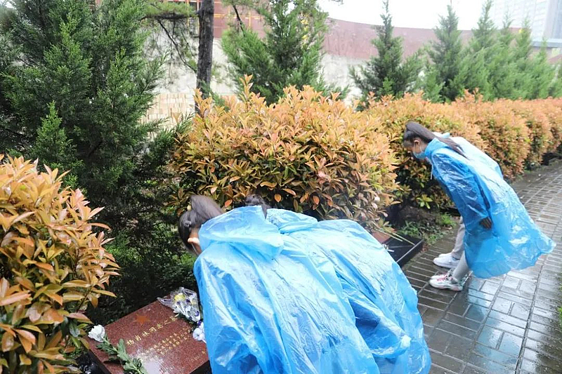 在革命烈士紀念碑前,團員、少先隊員代表手抬花籃緩步走向革命烈士紀念碑,向革命先烈敬獻花籃,投資公司和學校黨員代表整理挽聯。在一座座英雄墓碑前,全體人員向英雄烈士鞠躬默哀,并將胸前的小白花獻給英烈,表達對先烈的哀思和敬仰。
