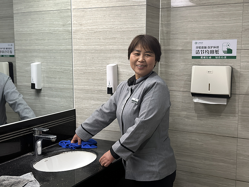 保衛(wèi)家園潔凈的“衛(wèi)士”,用腳步踏尋每一個(gè)角落,用雙手擦拭每一塊瓷磚,用最真摯的熱情,做好最普通的工作。