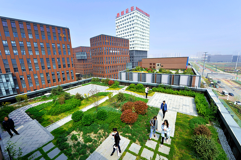 “上樓去散散步吧?!痹诳旃澴嗟默F代社會,很多被困于城市寫字樓內的白領,每天工作間歇最大的奢望,便是下樓找一塊綠地放松放松。然而,在灃西新城西部云谷,白領們只需移步樓頂,便能瞬間完成辦公室到公園的無縫切換。作為建設海綿城市的重要探索,近年來,灃西新城部分園區辦公樓上建設了綠色屋頂。屋頂花園不僅能起到吸收、凈化雨水的作用,同時還能有效減碳吸碳,降霾去熱,成為城市一道稀有景觀。